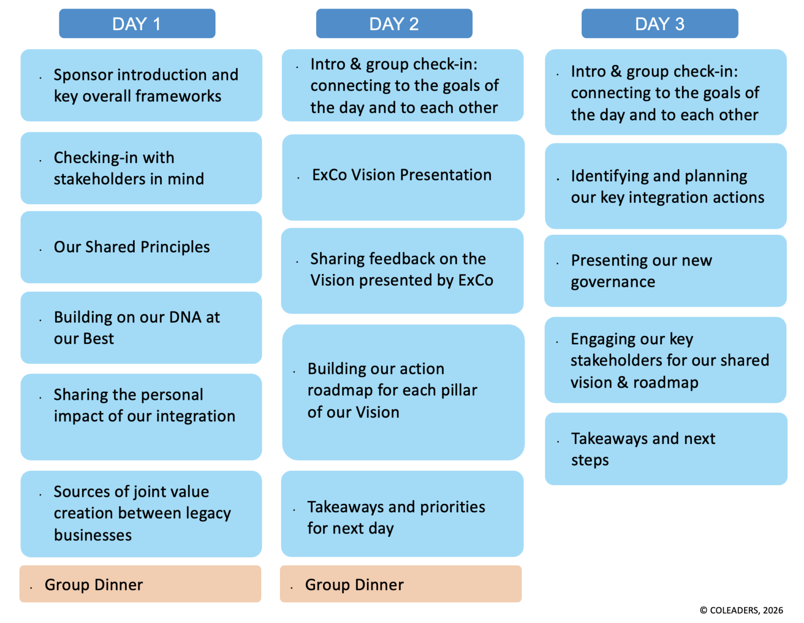 - Day 3 Morning. Collective intelligence session to identify key integration workstreams and cocreate stakeholder engagement plan.